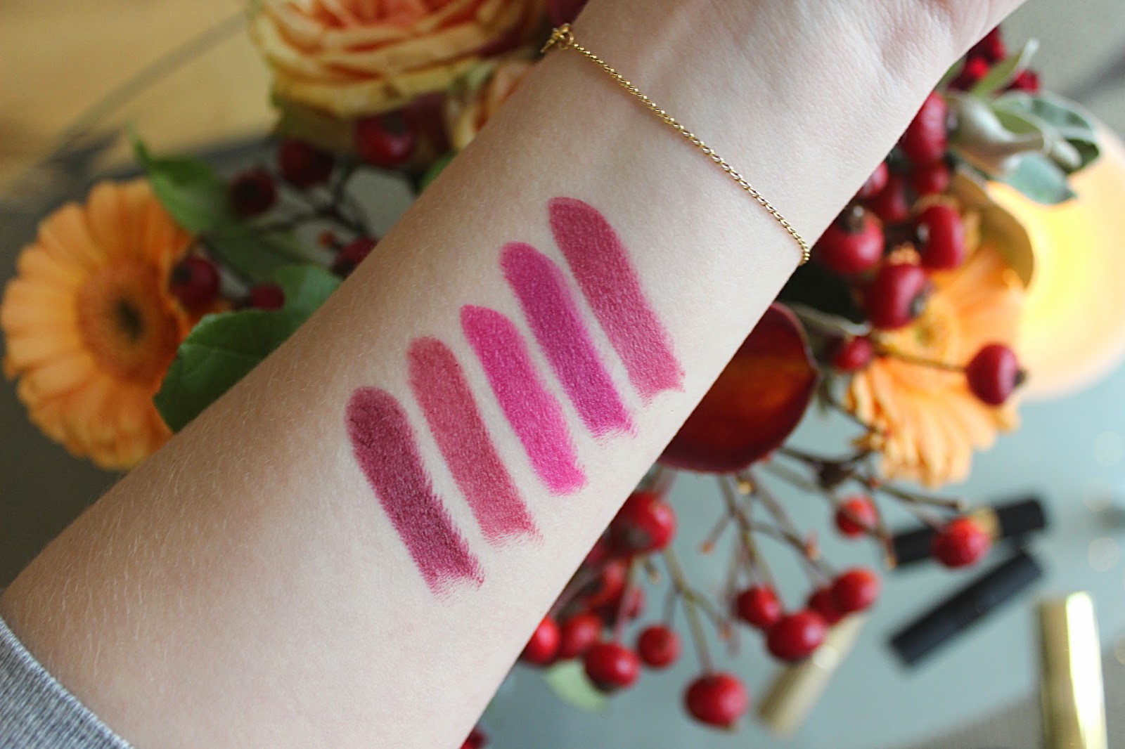 The next shade is a new one from Bobbi Brown from the Scotch On The Rocks Collection in the shade Bordeaux. This is closer to a dark red/brown shade but works really well this time of year. In the middle is Melanie from Joan Collins, and can we just take a moment to appreciate the beautiful gold packaging?! This is definitely in more in the bright pink category but I think it’s definitely got some berry tones running through it.